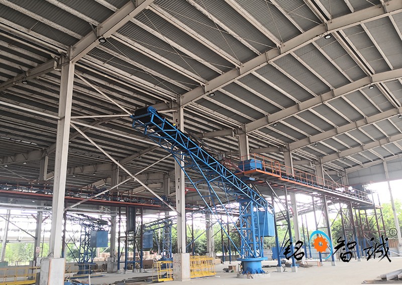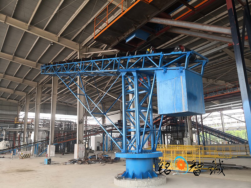 旋轉(zhuǎn)式皮帶輸送機(jī),為散碎物料倉貯輸送設(shè)備,是在安裝有行走輪的支架上部的底盤上安裝一轉(zhuǎn)盤,轉(zhuǎn)盤可相對(duì)底盤作旋轉(zhuǎn)運(yùn)動(dòng),皮帶輸送機(jī)的進(jìn)料端座在轉(zhuǎn)盤頂部的托盤上,出料端為懸臂式,配重箱在托盤上用以上與懸臂配重,倉貯時(shí),物料通過料斗由輸送帶送至遠(yuǎn)端,推動(dòng)懸臂即可改變堆積位置,在庫房內(nèi)實(shí)現(xiàn)多點(diǎn)堆積而勿需停機(jī)和移動(dòng)機(jī)體,連續(xù)作業(yè)省時(shí)省力,操作方便,尤其適用于糧食的倉貯輸送。